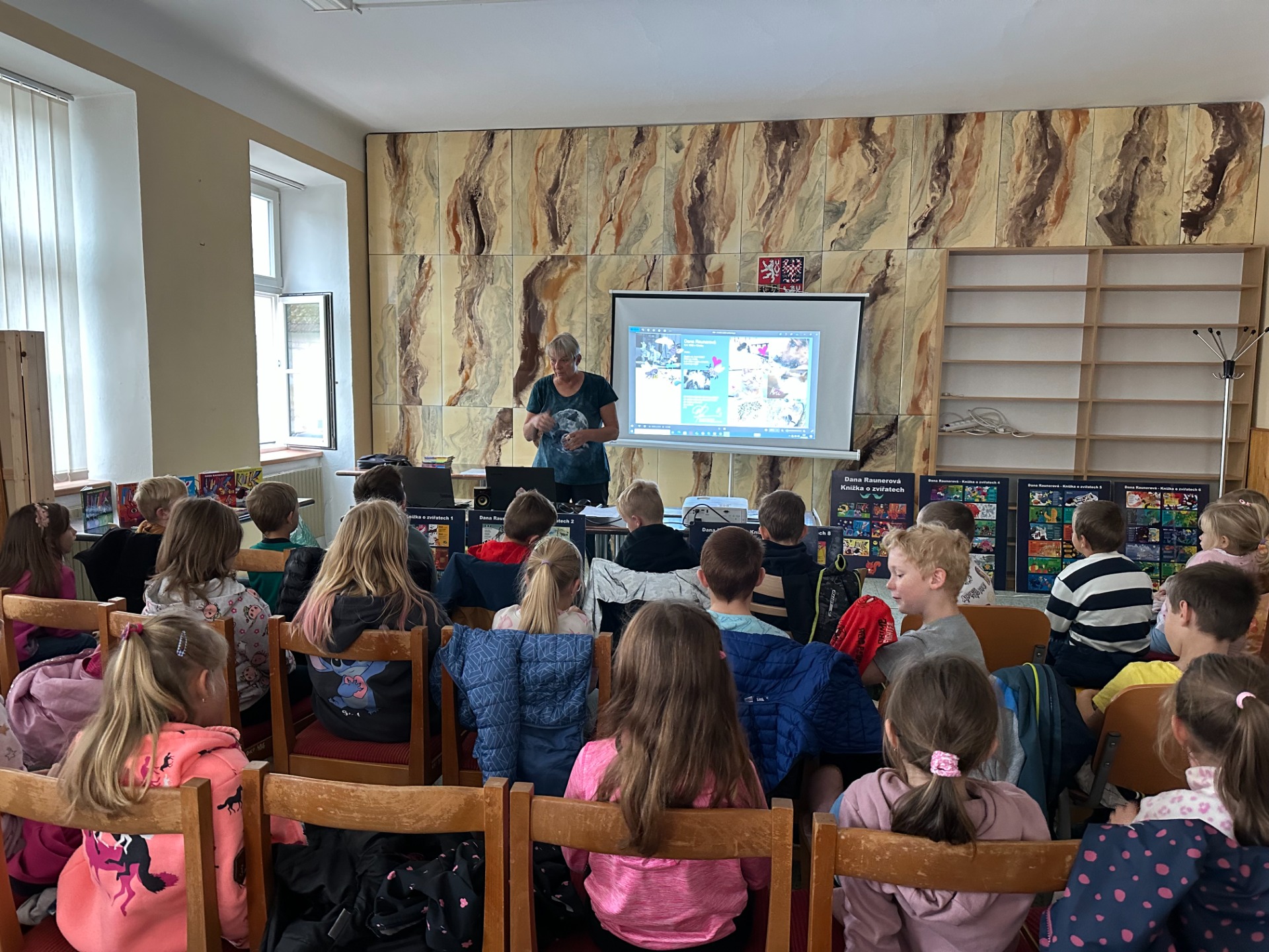 V rámci týdnu knihoven byla pro děti 1. - 3. třídy připravena beseda s paní Danou Raunerovou, autorkou řady dětských knih o zvířátkách doplněné o vlastní kresby.
